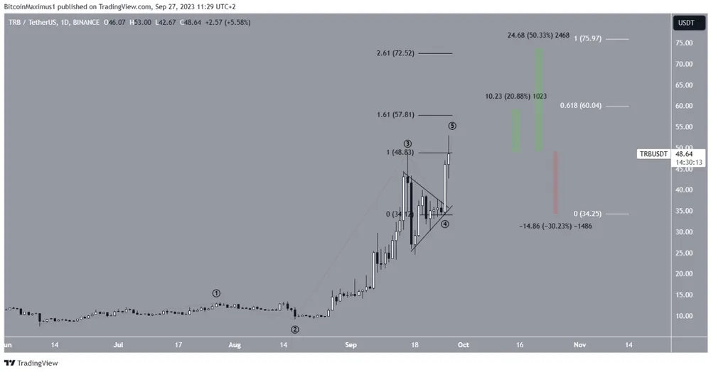 Trong trường hợp đó, giá TRB có thể giảm 30% và quay về vùng hỗ trợ 35 USD.