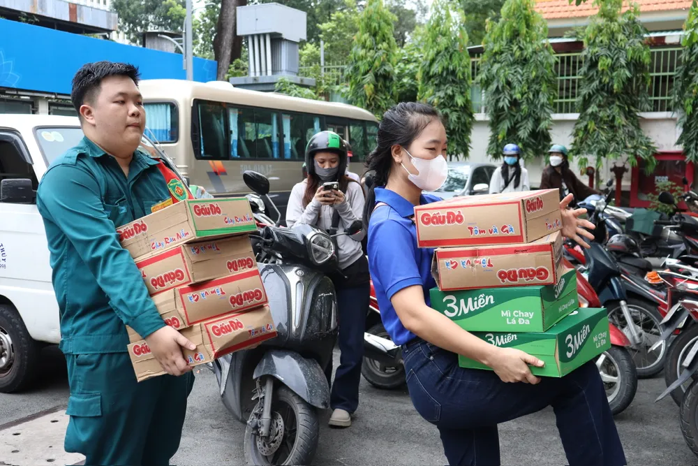 Cách đó không xa, sáng sớm cuối tuần, tại số 5 Đinh Tiên Hoàng (phường Sài Gòn, TPHCM), không khí cũng rất rộn ràng. Rất đông tình nguyện viên của Đội Công tác xã hội Thanh niên TPHCM có mặt từ sớm để phân loại, sắp xếp và đóng gói từng phần nhu yếu phẩm, chuẩn bị cho những chuyến xe cứu trợ sẽ lăn bánh trong những ngày tới.