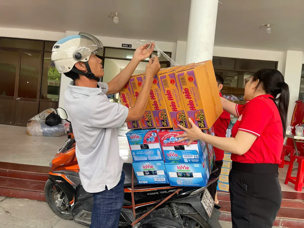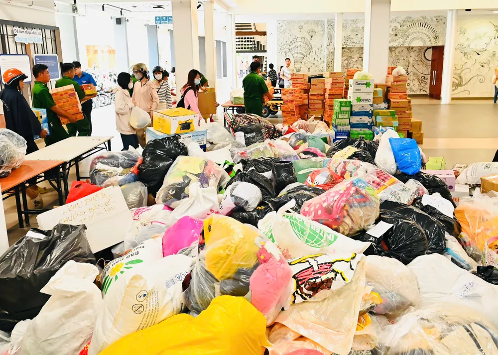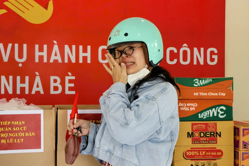 Sáng 22-11, Trung tâm Phục vụ hành chính công xã Nhà Bè (330 Nguyễn Bình, xã Nhà Bè) đông đúc khác thường. Ngày thường, đây là nơi người dân đến làm thủ tục giấy tờ. Hôm nay, hành lang, sảnh chờ đều đầy ắp thùng mì tôm, bao tải quần áo, chăn mền, bánh kẹo, phong bì tiền mặt… Đó là những gửi gắm, là tình cảm và là sự chia sẻ hướng về đồng bào miền Trung đang oằn mình sau lũ.