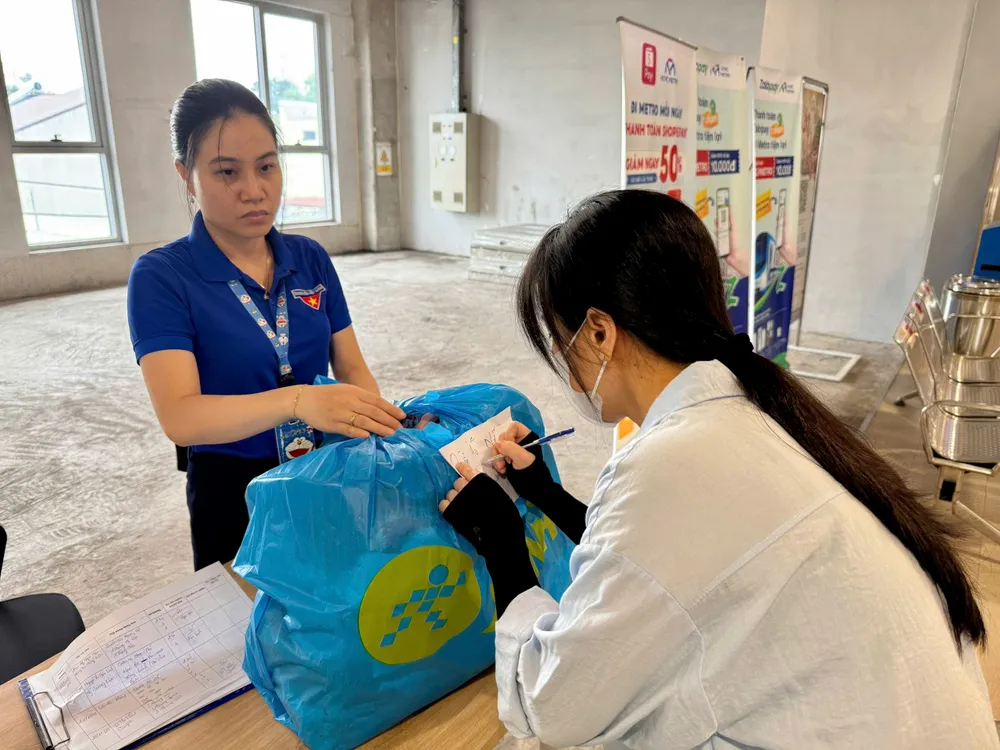 Tại ga Bình Thái, lượng hàng đổ về quá nhiều khiến phòng tiếp nhận chật kín, phải phân chia các vật phẩm. Nhân viên metro phải nhanh chóng bố trí thêm khu vực bên ngoài để kịp nhận hàng cứu trợ. Từ nhân viên đến bảo vệ, ai cũng tự động xắn tay hỗ trợ người đẩy xe, người xuống tận tầng 1 nhận hàng cồng kềnh giúp bà con rồi vận chuyển lên khu vực tập kết.
