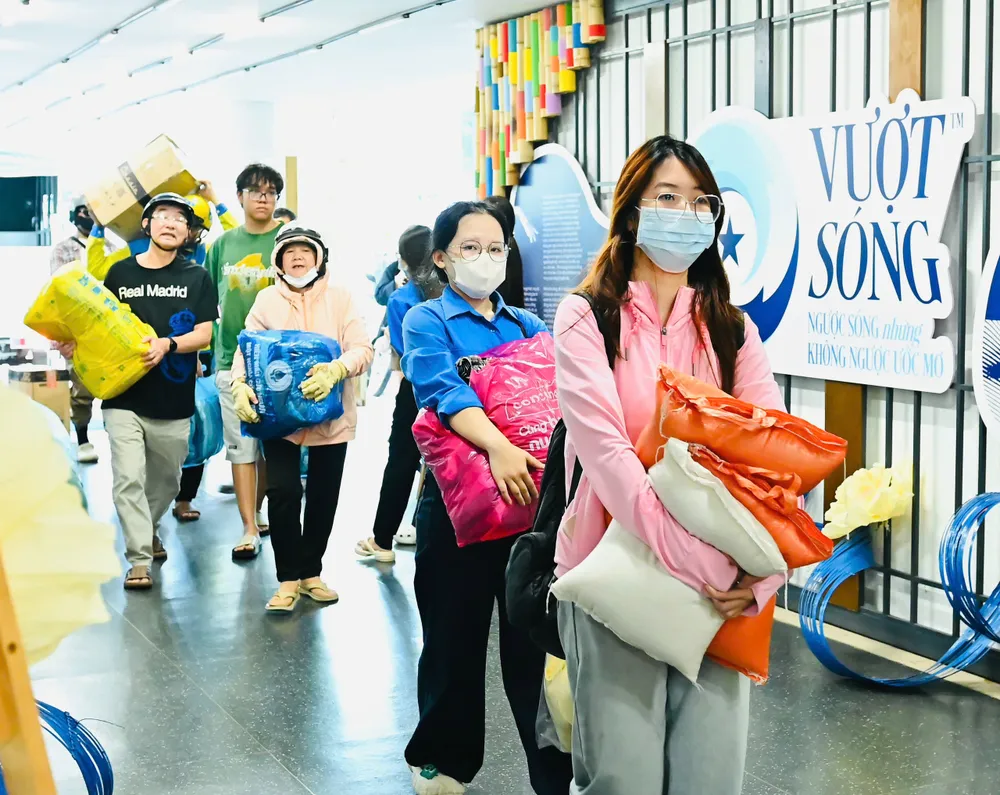Sáng sớm 22-11, tiết trời TPHCM lất phất mưa. Dù vậy, những dòng người vẫn đội mưa tìm đến các ga metro số 1 để gửi đi từng món quà, từng thùng hàng dành cho đồng bào miền Trung đang oằn mình trong bão lũ.
