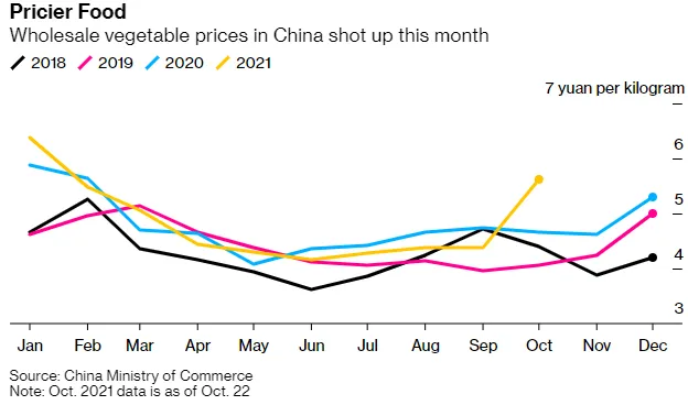 Bên cạnh đó cũng có lo ngại rằng thời tiết khắc nghiệt có thể ảnh hưởng đến việc sản xuất và vận chuyển rau củ. Vài tuần trở lại đây, giá rau củ bán buôn tại Trung Quốc đã tăng vọt, có khi đắt hơn cả giá thịt, sau khi những trận mưa lớn làm ngập các vùng sản xuất chủ chốt ở phía bắc và tỉnh Sơn Đông – địa bàn trồng trọt dẫn đầu cả nước.