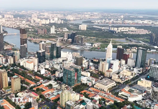 Trung tâm TPHCM và khu vực bán đảo Thủ Thiêm, nơi được đầu tư phát triển Trung tâm tài chính quốc tế tại TPHCM. (Ảnh: Hồng Đạt/TTXVN)