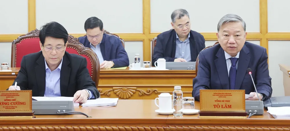 Tổng Bí thư Tô Lâm và Chủ tịch nước Lương Cường tại phiên họp lần thứ hai Ban Chỉ đạo Trung ương về tổng kết việc thực hiện Nghị quyết số 18-NQ/TW. Ảnh: TTXVN