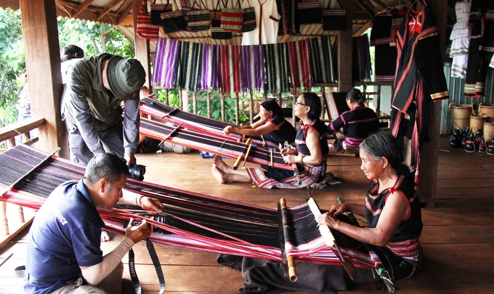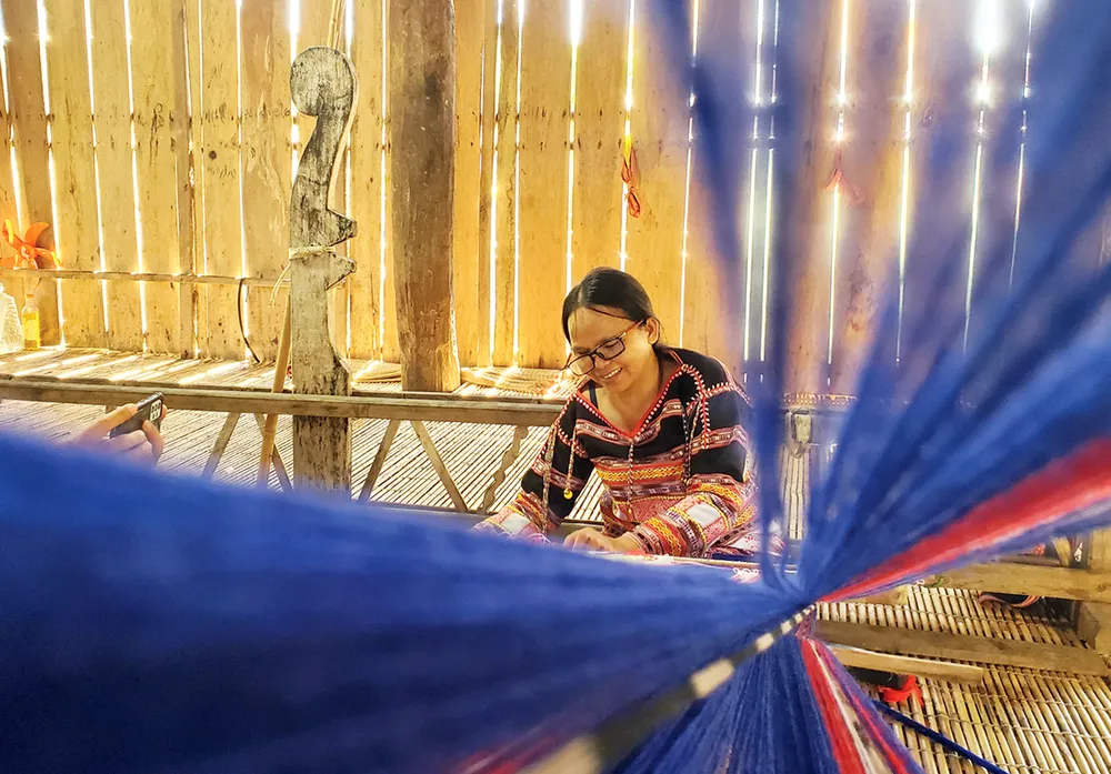 Người phụ nữ Jrai đang trình diễn, hướng dẫn các du khách, nhiếp ảnh gia để quảng bá vải vóc đại ngàn. Ảnh: HOÀNG PHẠM