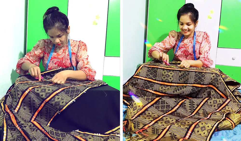 Nghệ nhân trẻ Phạm Thị Sung (31 tuổi, làng Teng), người tiên phong mở “shop thổ cẩm Hrê” và đưa thổ cẩm lên các nền tảng mạng xã hội.