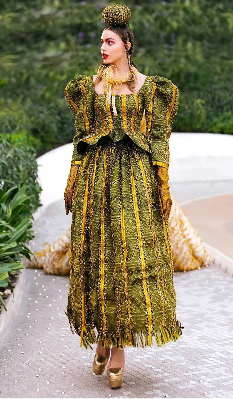 Thổ cẩm Hrê được người trẻ làng Teng sáng tạo đưa qua trình diễn, quảng bá tại Triển lãm thế giới EXPO diễn ra tại Dubai năm 2021 – 2022. Ảnh: Y HOA
