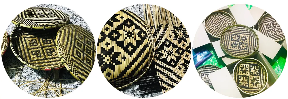 Các sản phẩm đan lát truyền thống ứng dụng hoa văn thổ cẩm Hrê trở nên độc đáo, bắt mắt hơn. ẢNH: Y HOA