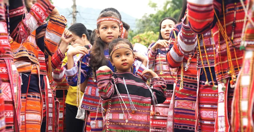 Bé gái Ba Na ấn tượng trong bộ trang phục bằng thổ cẩm truyền thống của dân tộc mình