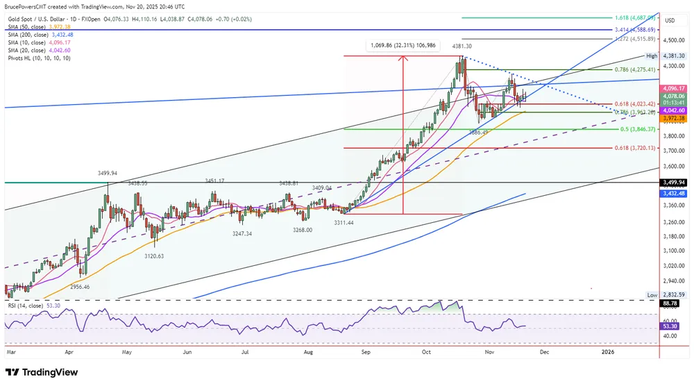 Về kỹ thuật, vùng 3.998 USD tiếp tục là mốc xoay bò-gấu quan trọng. Nếu giá xuyên thủng vùng 3.998-4.023 USD, vàng có thể lùi nhanh về đường trung bình 50 ngày tại 3.975 USD, trùng vùng Fibonacci 78,6% ở 3.963 USD. Xa hơn là đáy tháng 10 tại 3.886 USD. Ngược lại, chỉ khi giá vượt 4.110 USD và sau đó là 4.133 USD-4.245 USD, xu hướng phục hồi mới có cơ sở.
