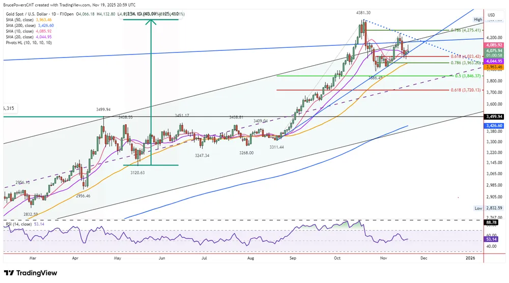 Mốc 4.056 USD/ounce tạm thời giữ vững vai trò là cụm hỗ trợ then chốt, khi trùng với đường trung bình 20 ngày, đường xu hướng ngắn hạn và mức thoái lui Fibonacci 61,8 phần trăm. Việc phòng thủ thành công khu vực này giúp bên mua vẫn còn cơ hội duy trì ưu thế.