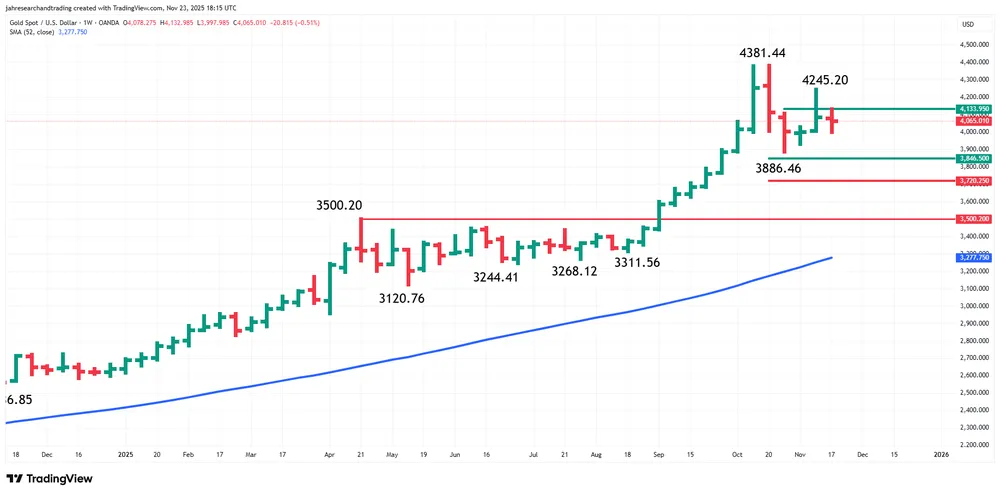 Về kỹ thuật, giá vàng đang bị chặn lại ở mốc xoay chiều quan trọng 4.133,95 USD/ounce. Nếu vượt qua, xu hướng có thể hướng lên 4.245,20, mức cản cuối trước khi tiến đến đỉnh lịch sử 4.381,44.