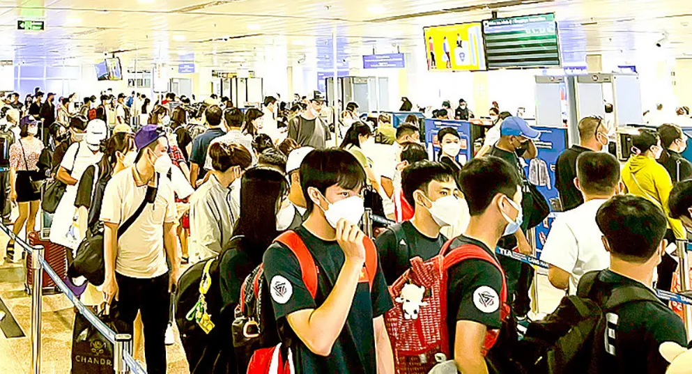 Khách xếp hàng làm thủ tục lên máy bay tại sân bay Tân Sơn Nhất. Ảnh: GIA HÂN