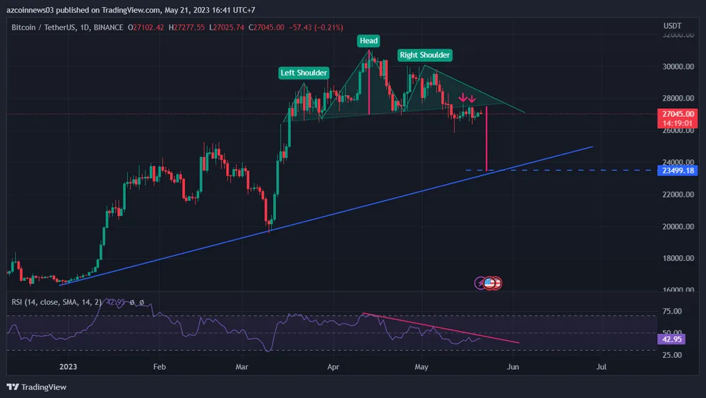 Các chỉ báo kỹ thuật cho thấy giá BTC đã sẵn sàng để giảm xuống mục tiêu của mô hình vai đầu vai thuận ở 23.300 USD.