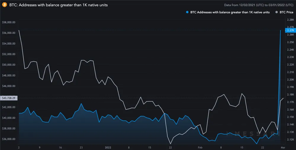 Dữ liệu của công ty nghiên cứu tiền điện tử CoinMetrics cũng cho thấy sự tăng đột biến đáng kể về số lượng địa chỉ nắm giữ ít nhất 1.000 BTC, thường được gọi là “cá voi”, từ 2.127 địa chỉ vào ngày 27-2, tăng vọt 2.266 địa chỉ vào ngày 28-2.