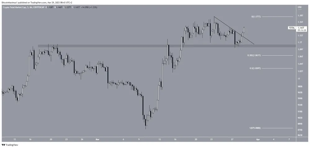 TOTALCAP đã tăng kể từ ngày 27-3 và đang trong quá trình tạo ra ba nến tăng liên tiếp. Cú bật lên đã xác thực vùng hỗ trợ ngang 1,09 nghìn tỷ USD và giúp giá bứt phá lên trên đường kháng cự giảm dần.
