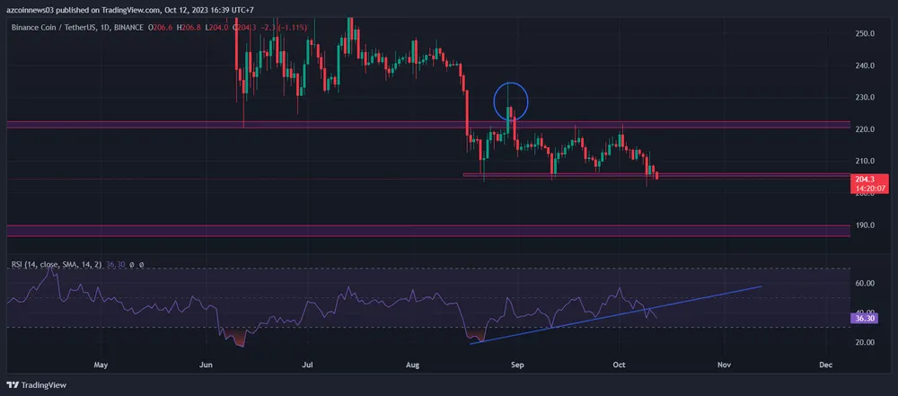 Kể từ đó, giá BNB đã giao dịch bên trong phạm vi từ 205 USD đến 221 USD. Hiện tại, BNB đang nằm ngay tại mức hỗ trợ của phạm vi.