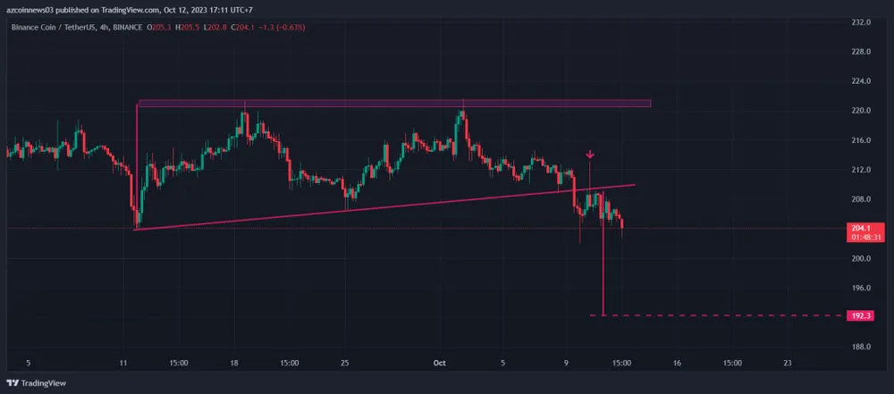 Biểu đồ 4 giờ ủng hộ khả năng tiếp tục giảm trên khung thời gian hàng ngày. Điều này là do giá BNB đã phá vỡ xuống dưới một tam giác tăng dần và xác nhận nó làm kháng cự vào ngày 10-10 (mũi tên màu đỏ).