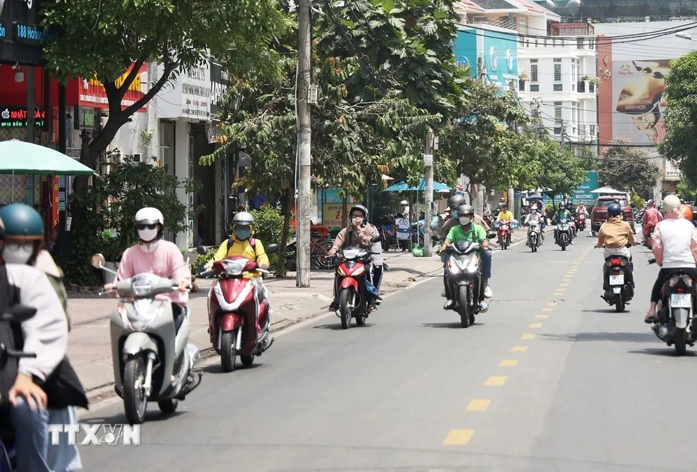 Người dân lưu thông bằng xe gắn máy trưa ngày 27/4/2023 trên đường Hoàng Diệu, thành phố Thủ Đức. Ảnh: Hồng Đạt - TTXVN