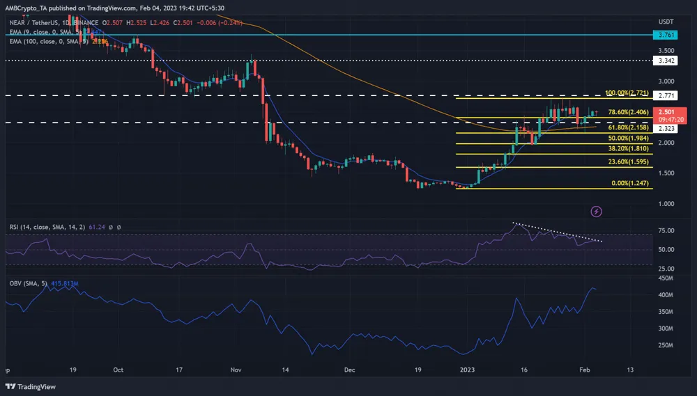 Biểu đồ hàng ngày cho thấy NEAR tăng giá trước đợt phục hồi thành công vào tháng 1 nhưng phải đối mặt với rủi ro từ chối ở mức kháng cự ngay phía trước là 2,721 USD. Tuy nhiên, hành động giá tăng ngược lại với Chỉ số sức mạnh tương đối (RSI) của nó.