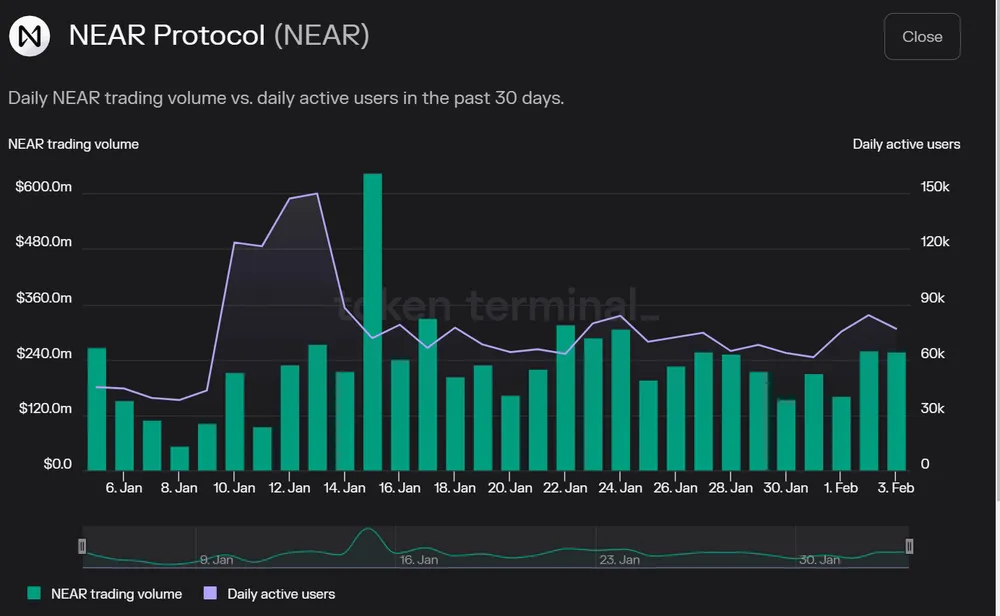 Mặt khác, số lượng người dùng hoạt động hàng ngày và khối lượng giao dịch NEAR giảm từ giữa tháng 1. Xu hướng cho thấy ít tài khoản giao dịch, có thể làm giảm áp lực mua cần thiết cho đà tăng mạnh.