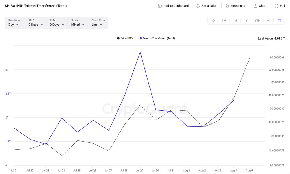 Ngược lại, khi thị trường phản ứng với thông báo của Binance, Shiba Inu nhanh chóng lấy lại sức hút. Như được mô tả trong biểu đồ bên dưới, vào cuối ngày 4-8, số token được chuyển hàng ngày tăng 41% và đạt 4,1 nghìn tỷ SHIB.