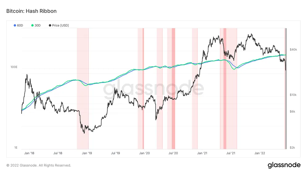 Hash Ribbon sử dụng đường trung bình động 30 ngày và 60 ngày của tỷ lệ băm để xác định thời điểm xảy ra tình trạng đầu hàng của thợ đào. Khi 30 ngày tăng vượt qua 60 ngày, có thể giả định rằng “điều tồi tệ nhất” đã qua khi các thợ đào quay trở lại làm việc.