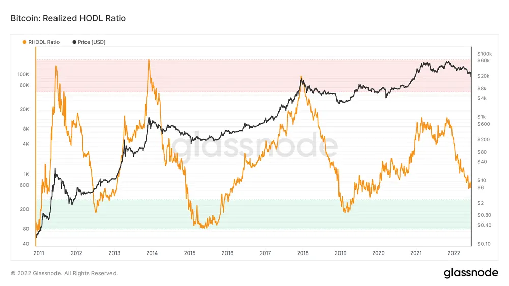 Theo dữ liệu từ Glassnode, về cơ bản một khi RHODL vào vùng xanh, nó cho thấy rằng “đầu hàng” đang ở mức cao nhất và giá sàn sắp xảy ra hoặc đã được thiết lập. Cho đến nay, RHODL vẫn chưa bước vào vùng xanh của mình.
