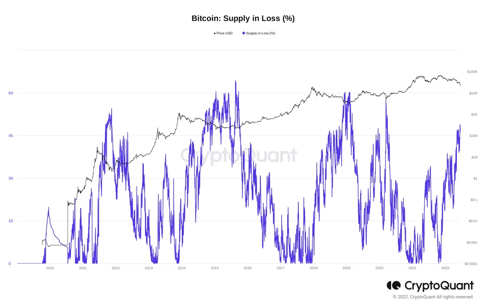 Tỷ lệ phần trăm nguồn cung của Bitcoin thua lỗ. Nguồn: CryptoQuant