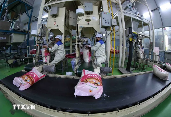 Dây chuyền đóng gói gạo xuất khẩu của Việt Nam. (Ảnh: Vũ Sinh/TTXVN)