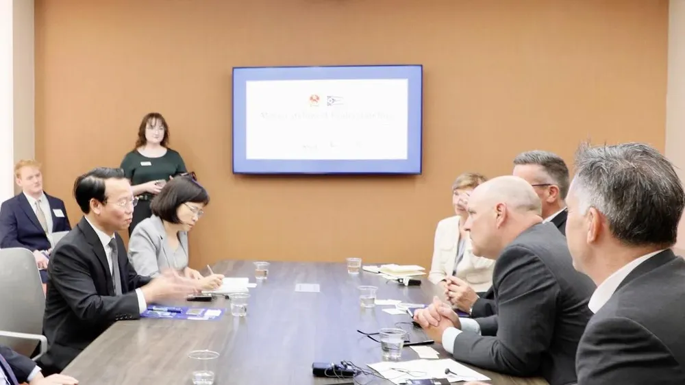 Bộ trưởng Bộ Nông nghiệp và Môi trường Việt Nam Đỗ Đức Duy tại cuộc hội đàm với các doanh nghiệp Hoa Kỳ tại bang Ohio. Ảnh: Đoàn đàm phán