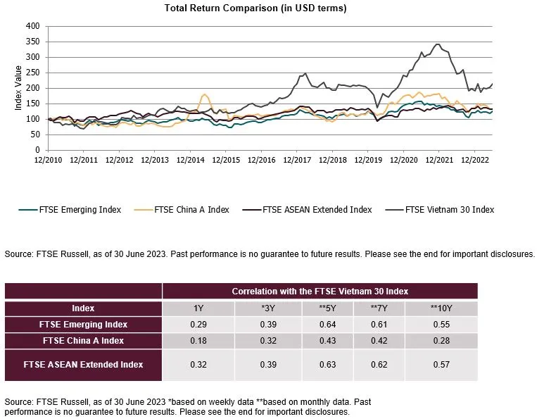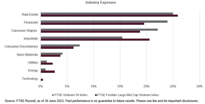 The FTSE Vietnam 30 Index, similarly to the broader Vietnamese market, is also more exposed to the Real Estate, Financials, Consumer Staples and Industrials, with an aggregated weighting of 86.4%, as of 30 Jun 2023. Financials and Industrials were the largest contributors to the FTSE Vietnam 30 Index’s positive first half of 2023, with a weighted average total return of 7.3% and 6.3% in USD terms respectively, while Consumer Staples dragged on the index with a negative weighted total average return of 2.5%, caused by a short-term downturn in exports.