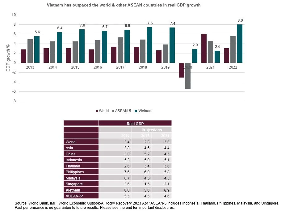 In recent years, Vietnam has taken the baton from China and benefitted from supply chain relocations, strong foreign direct investment, and political stability. Having witnessed robust growth momentum of approximately 8% since the global pandemic, the fastest annual pace since 1997. Spurred by an increase in both domestic demand and manufacturing exports. The International Monetary Fund (IMF) forecasts that Vietnam will grow its GDP by 5.8% in 2023 and by 6.9% in 2024, outperforming several other economies in the ASEAN region.
