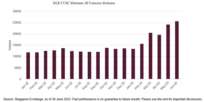 The partnership between FTSE Russell and the Singapore Exchange (SGX), to develop a comprehensive Asia and emerging markets focused, multi-asset derivatives offering began in 2020. Two Vietnamese equity index futures based on the FTSE Russell indices were launched on the SGX in 2021, making it easier for investors to manage the risk associated with Vietnamese equities. Together with the two FTSE Vietnam 30 ETFs (totaling an AUM of USD867 million as of 30 Jun 2023), an ecosystem has gradually evolved to offer international investors effective access to, and hedges on, the Vietnamese market. YoY, the SGX FTSE Vietnam 30 Futures have seen a 59% increase in volumes traded, with higher volumes and open indications of interest being reached over several months through 2023.