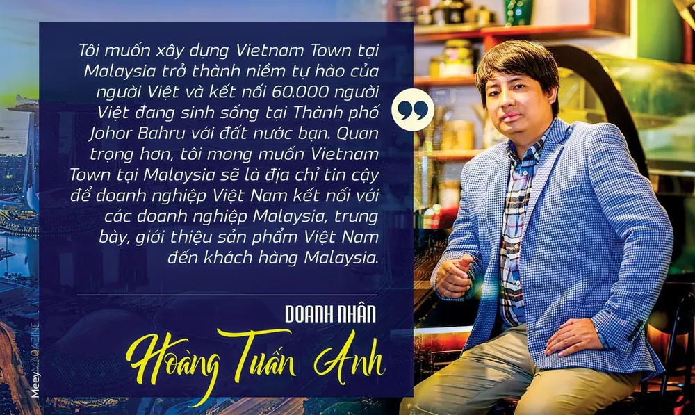 - Tôi muốn xây dựng Vietnam Town tại Malaysia trở thành niềm tự hào của người Việt, và kết nối 60.000 người Việt đang sinh sống tại thành phố Johor Bahru với đất nước bạn. Quan trọng hơn, tôi mong muốn Vietnam Town tại Malaysia sẽ là địa chỉ tin cậy để DN Việt Nam kết nối với DN Malaysia, trưng bày, giới thiệu sản phẩm Việt Nam đến khách hàng Malaysia.
