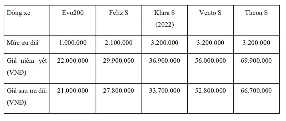 Cụ thể, trong thời gian khuyến mãi, hãng xe Việt tung chương trình ưu đãi tặng 1 triệu đồng cho Evo200; 2,1 triệu đồng cho xe Feliz S và 3,2 triệu đồng đối với 3 mẫu xe Klara S (2022), Vento S và Theon S. Các chính sách khuyến mãi này có hiệu lực khi mua xe trực tiếp tại hệ thống showroom và Đại lý VinFast trên toàn quốc.