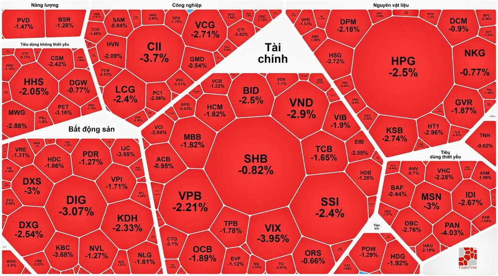 Nhóm chứng khoán cũng giao dịch kém tích cực: SSI (giảm 2,4%), VIX (giảm 3,95%), SHS (giảm 3,03%), VND (giảm 2,9%), HCM (giảm 1,82%)... Nhóm bất động sản, ngoại trừ VIC và VHM giữ được sắc xanh, phần lớn mã còn lại đều điều chỉnh sâu: KBC (giảm 3,68%), DXG (giảm 2,54%), PDR (giảm 1,27%), KDH (giảm 2,23%), CEO (giảm 2,07%).