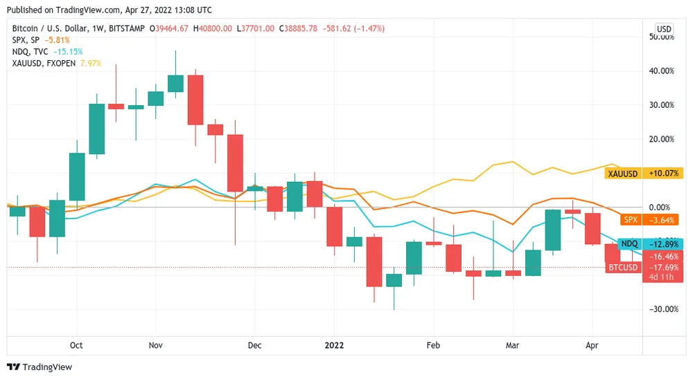 Biểu đồ 1 tuần của BTC/USD, XAU/USD, S&P 500, Nsadaq 100 | Nguồn: TradingView