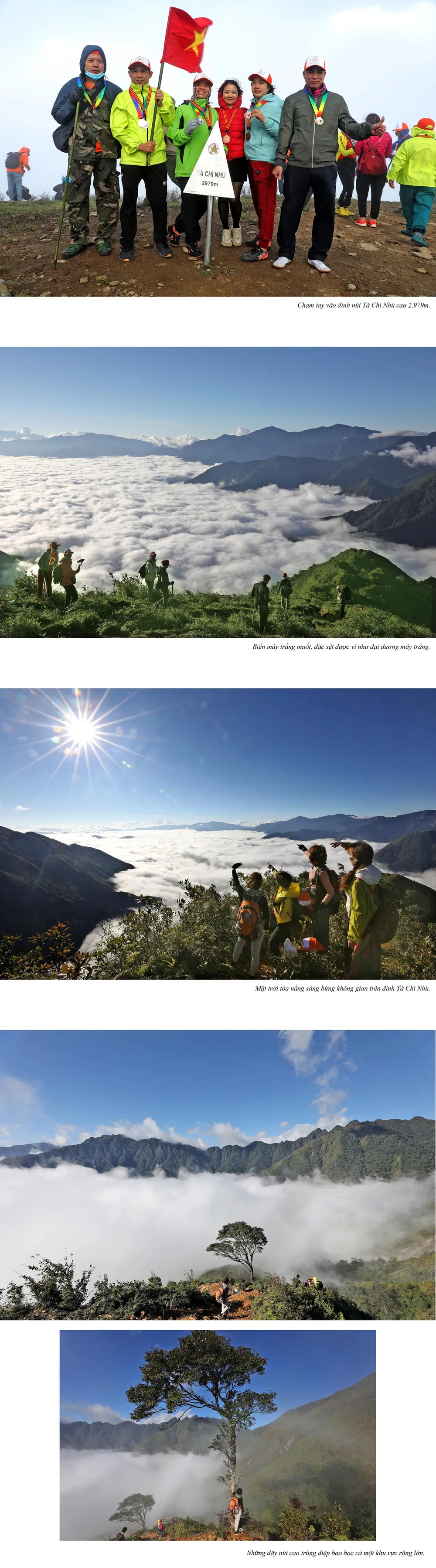 Khi du khách chạm tay được vào khối inox hình tam giác có ghi dòng chữ Tà Chì Nhù là đã chinh phục thành công đỉnh núi cao thứ 7 Việt Nam với một cung đường khá khó nhằn. Bạn có thể hoàn toàn tự hào về sức khỏe và ý chí của mình với Tà Chì Nhù. Trước mắt du khách lúc đó cả biển mây bồng bềnh như chốn tiên cảnh, đầy chất thơ và huyền ảo. Nếu chọn đi vào những hôm trời nắng đẹp du khách sẽ còn được chứng kiến cảnh nắng và gió đuổi nhau trên thảm mây trắng ngần.