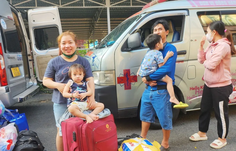 Niềm vui của thân nhân người bệnh khi về quê đón Tết trên chuyến xe 0 đồng. (Ảnh: Đinh Hằng/TTXVN)