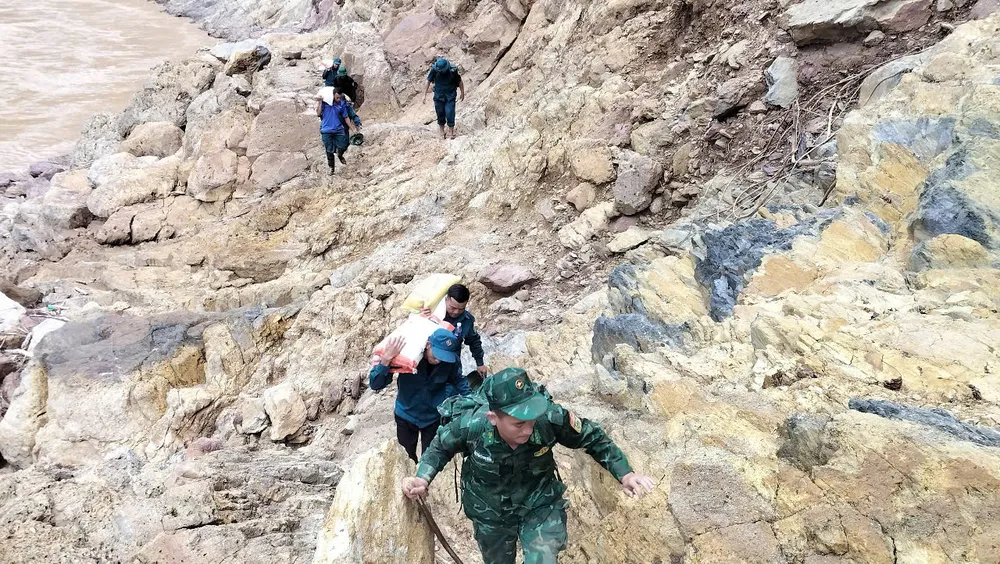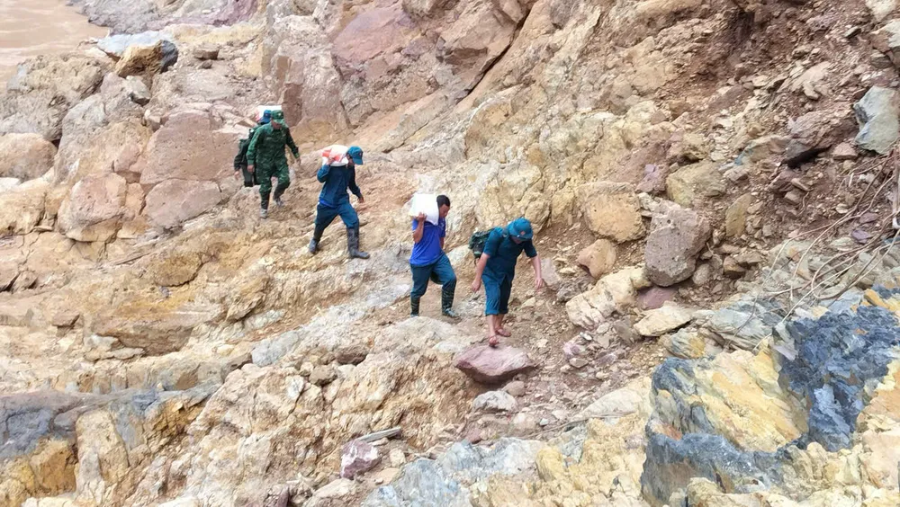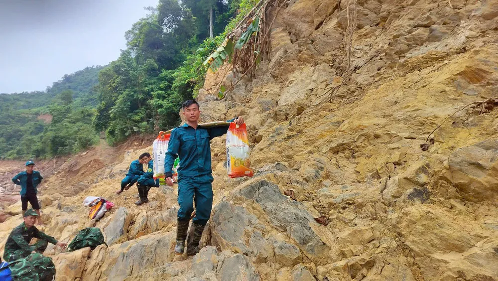 Để đưa được gạo, nhu yếu phẩm vào giúp bà con là hành trình hết sức gian nan, nguy hiểm, vất vả. Các lực lượng phải vận chuyển bằng xe máy băng qua những đoạn đường sạt lở, bùn đất đến bản Xằng Trên.