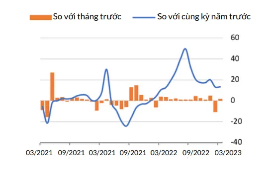 Là đầu vào chính của ngành dệt may và da giày, nhập khẩu bông, sợi dệt, vải và giày dép cũng giảm 21%. Một số dấu hiệu cải thiện đã được ghi nhận vào tháng 3/2023 khi xuất khẩu tăng 13,5% (so với tháng trước) và nhập khẩu tăng 24,4% (so với tháng trước). Cán cân thương mại tiếp tục thặng dư (650 triệu USD) trong tháng Ba, mặc dù đã thu hẹp so với mức 2,8 tỷ USD được ghi nhận của tháng 2/2023.