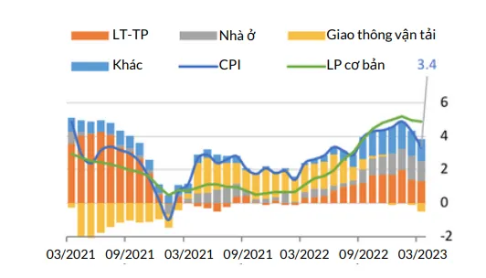 Lạm phát được thúc đẩy bởi mức tăng giá lương thực và thực phẩm cũng như nhà ở và vật liệu xây dựng, với mức đóng góp vào CPI lần lượt là 1,3 điểm % và 1,2 điểm %. Giá dịch vụ giao thông giảm 4,9% so với cùng kỳ vào tháng 3/2023, giúp giảm 0,5 điểm % tỷ lệ lạm phát CPI. Giao thông vận tải chỉ góp phần khá nhỏ vào lạm phát CPI kể từ tháng 10 năm 2022 tới nay, nhờ thị trường dầu mỏ toàn cầu tương đối ổn định.