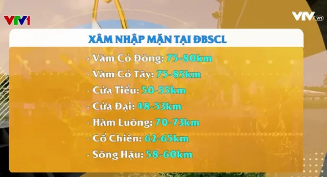 Phạm vi mặn 4g/lít sẽ vào sâu các cửa sông Vàm Cỏ Đông, Vàm Cỏ Tây từ 75-85km; vùng các cửa sông Cửu Long như Cửa Tiểu, Cửa Đại từ 48-55km, Hàm Luông, Cổ Chiên, Sông Hậu từ 58-73km.