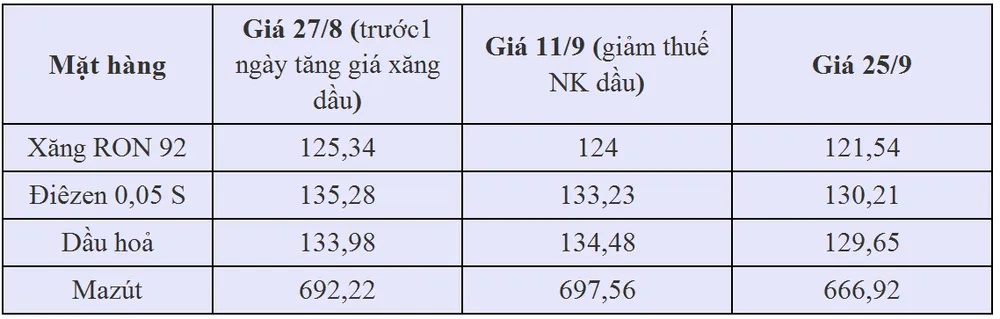 So với thời điểm ngày 11-9, khi các doanh nghiệp đòi tăng giá trên dưới 1.000 đồng/lít nhưng Bộ Tài chính quyết định không tăng giá mà giảm thuế nhập khẩu dầu và tăng mức trích quỹ bình ổn, đến nay giá các sản phẩm xăng dầu đều thấp hơn.