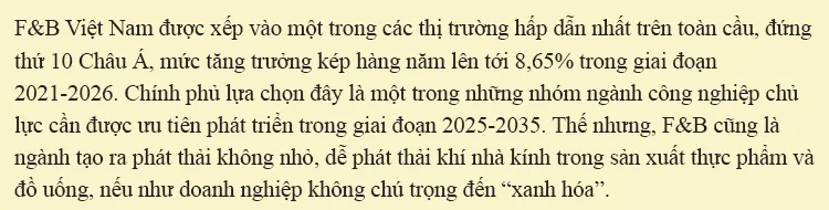 Tiềm năng tăng trưởng lớn, thế nhưng ngành thực phẩm và đồ uống cũng là ngành tạo ra phát thải không nhỏ. Tại hội thảo tập huấn về “Kiểm kê và giảm nhẹ phát thải khí nhà kính cho doanh nghiệp sản xuất thực phẩm và đồ uống”, ông Nguyễn Tuấn Quang, Phó Cục trưởng Cục Biến đổi khí hậu, Bộ Tài nguyên và Môi trường, chia sẻ phát thải từ ngành sản xuất thực phẩm và đồ uống chiếm khoảng 26% lượng khí thải toàn cầu, con số này có thể tăng gần gấp đôi vào năm 2050. Nhận thức rõ những điều này, không ít doanh nghiệp trong ngành thực phẩm và đồ uống của Việt Nam đang nỗ lực đưa ra nhiều giải pháp để xanh hoá, phát triển bền vững. Việc này không chỉ là xu hướng mà còn giúp các doanh nghiệp nâng cao tính cạnh tranh nhất là khi xuất khẩu hàng vào các thị trường khó tính, nơi người tiêu dùng có đòi hỏi cao với các sản phẩm từ các nhà máy xanh.