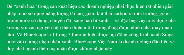Vậy tìm kiếm vật liệu thân thiện ở đâu để dần thay thế những vật liệu truyền thống? Tại thị trường Việt Nam, một số nhà sản xuất đang bắt theo xu hướng rất nhanh và cung ứng ra thị trường những giải pháp tối ưu. BlueScope là một cái tên điển hình. Năm 2022, ngành vật liệu xây dựng của Việt Nam có ba thương hiệu được hội đồng công trình xanh Singapore cấp chứng nhận nhãn xanh. Trong đó NS BlueScope Việt Nam là doanh nghiệp đầu tiên và duy nhất ngành thép mạ nhận được chứng nhận này. Bên cạnh đó, các dòng sản phẩm tôn cao cấp của doanh nghiệp ứng dụng trong phân khúc công nghiệp như COLORBOND®, COLORBOND® For Panel và ZINCALUME®… đã chinh phục thành công các quy định khắt khe và đạt được chứng nhận nhãn xanh của hội đồng công trình xanh Singapore.
