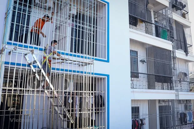 Hộ dân lắp thang thoát hiểm tạo lối thoát thứ hai tại khu trọ của nhà mình. (Ảnh: Hoài Nam/Vietnam+)