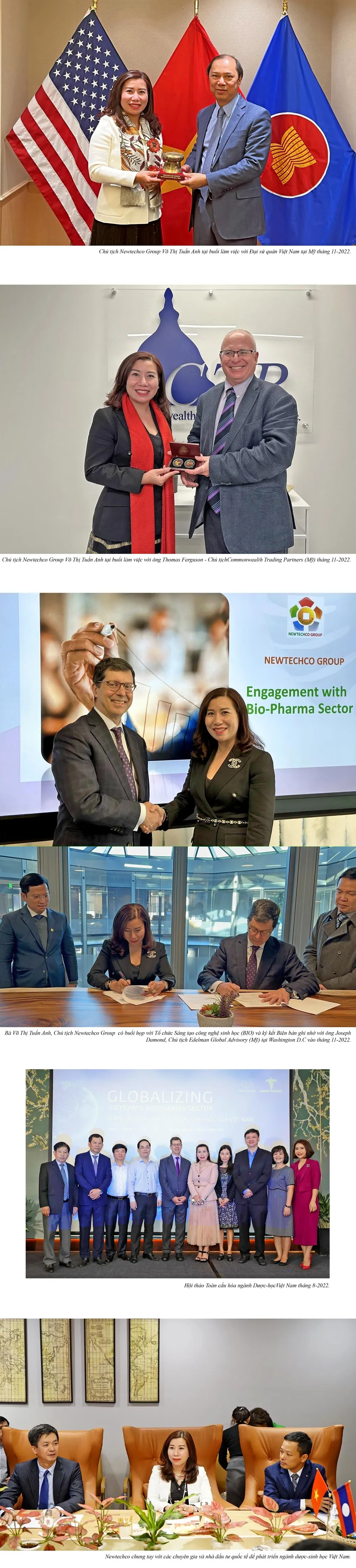 Trong chuyến công tác của tôi tại Mỹ vào tháng 11-2022, Newtechco Group đã ký kết Bản ghi nhớ hợp tác giữa Newtechco Group, Công ty Sakae Pharma, với ông Joseph Damond, Chủ tịch Edelman Global Advisory, với các nội dung hợp tác chính bao gồm: (1) Tham gia tài trợ cho đề án Sách trắng (White Paper) về lộ trình quốc tế hóa ngành dược - sinh học Việt Nam; (2) Tư vấn cho dự án phát triển Khu công nghệ Dược - Sinh học tại Việt Nam.