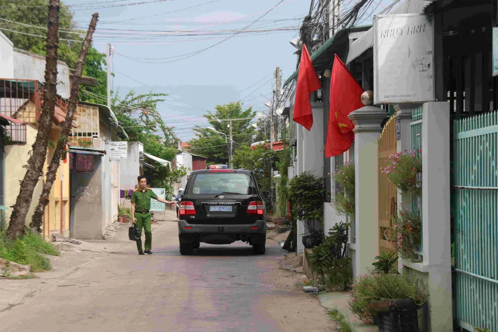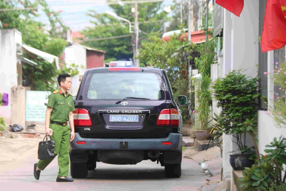 Xe của Bộ Công an chở theo nhiều lực lượng có mặt tại nhà riêng cựu Phó Chủ tịch UBND tỉnh Bình Thuận Nguyễn Ngọc. Ảnh: NGUYỄN TIẾN